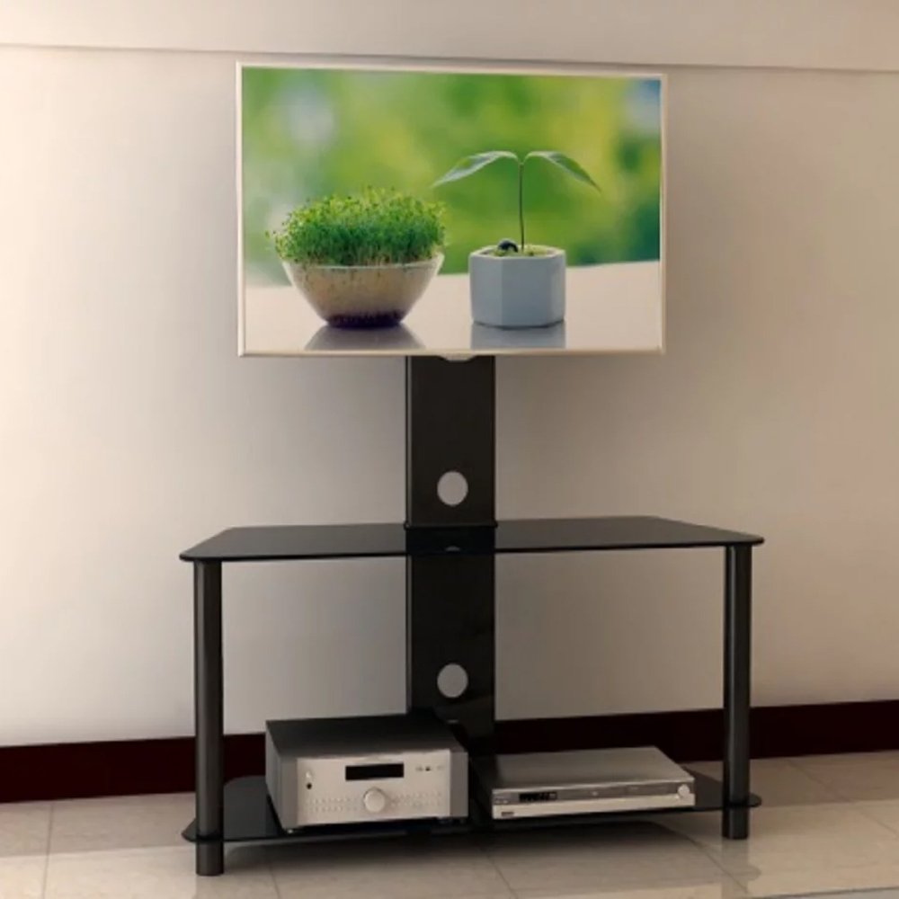 Constructed with steel columns and legs, this two shelves TV stand offers a clean look that is complemented by 100% secure mail-order shipping packaging at an extra-low price. The stand features thick tempered glass and a powder-coated steel frame for durability and lasting beauty. High-quality construction and open architecture maximize airflow and provide the enhanced strength needed to handle even the largest televisions. A cable management system is located at the rear of the stand to hide those unsightly cables from view. Integrated TV mount supports flat-panel TVs up to 46’’ with a maximum weight of 40kg/88lbs. The TV can be hung on the included mount. Bearing easy installation in mind, this stand is designed for assembling in minutes.