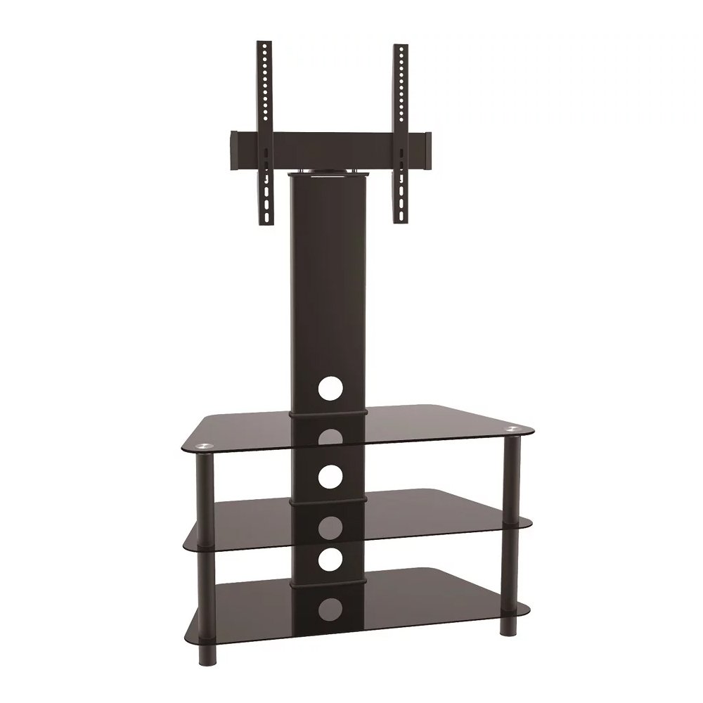 Constructed with steel columns and legs, this three shelves TV stand offers a clean look that is complemented by 100% secure mail-order shipping packaging at an extra-low price. The stand features thick tempered glass and a powder-coated steel frame for durability and lasting beauty. High-quality construction and open architecture maximize airflow and provide the enhanced strength needed to handle even the largest televisions. A cable management system is located at the rear of the stand to hide those unsightly cables from view. Integrated TV mount supports flat-panel TVs up to 46’’ with a maximum weight of 40kg/88lbs. The TV can be hung on the included mount. Bearing easy installation in mind, this stand is designed for easy assembly.