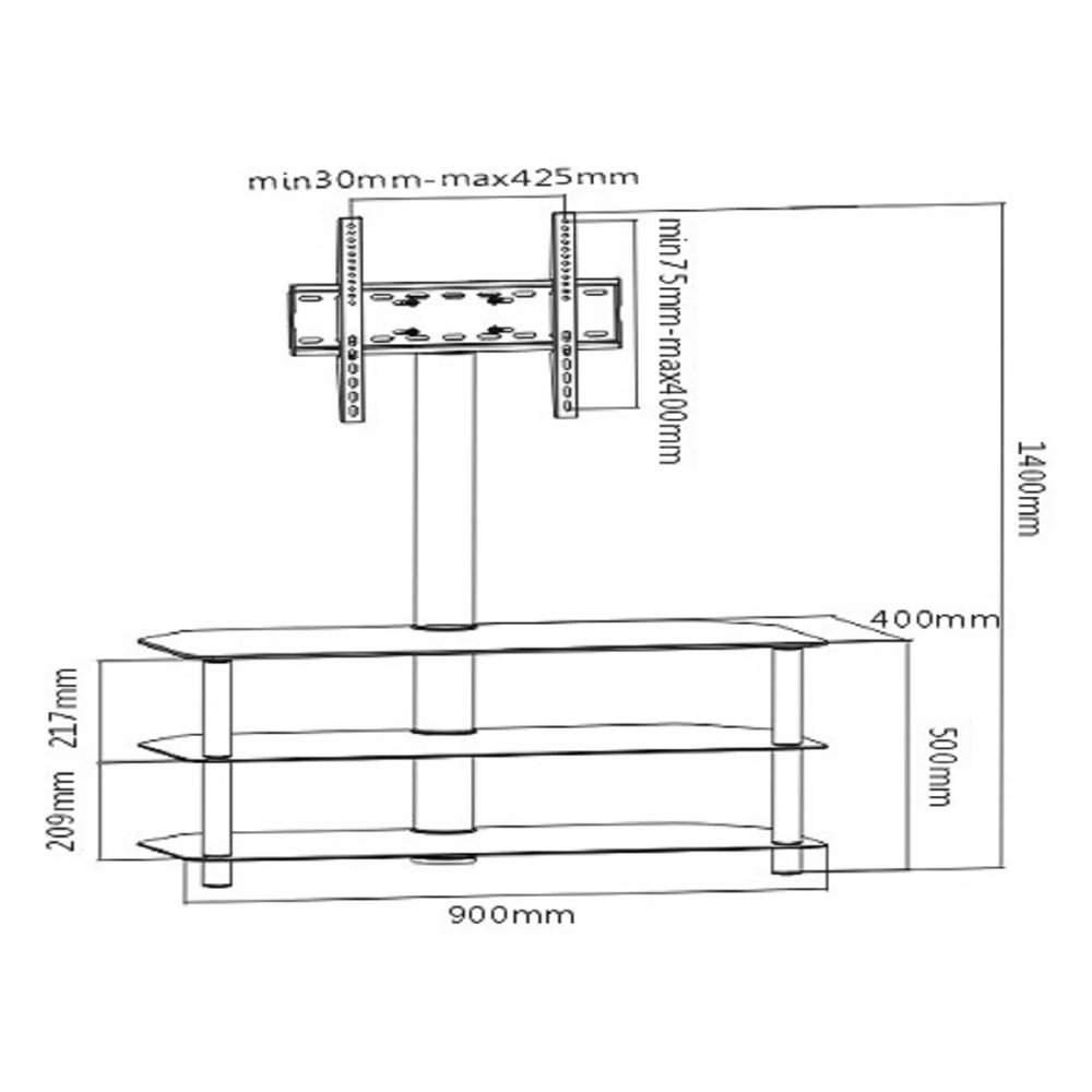 The SH 355FS 3-Tier Corner-Notched Media Console with TV Bracket is a part of the Economy Series and offers an affordable and functional solution for your home entertainment setup. This media console is designed with a blend of metal and glass materials, providing both durability and a sleek, contemporary look.Constructed with steel columns finished in powder coating for added strength, the media console is stable and reliable. The column size varies with 38mm and 80mm options, while the black color adds a touch of elegance to your living space.This console has dimensions of 900mm x 400mm x 1400mm, making it suitable for most 23" to 55" screens. It has a maximum load capacity of 40kg (88lbs), ensuring it can securely support your TV and entertainment equipment. The Max.VESA compatibility is 400x400mm, allowing you to mount your TV with ease.