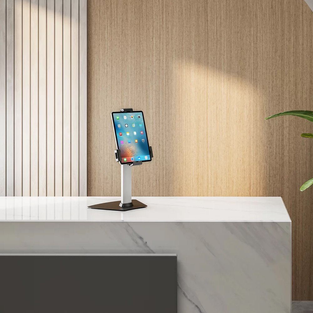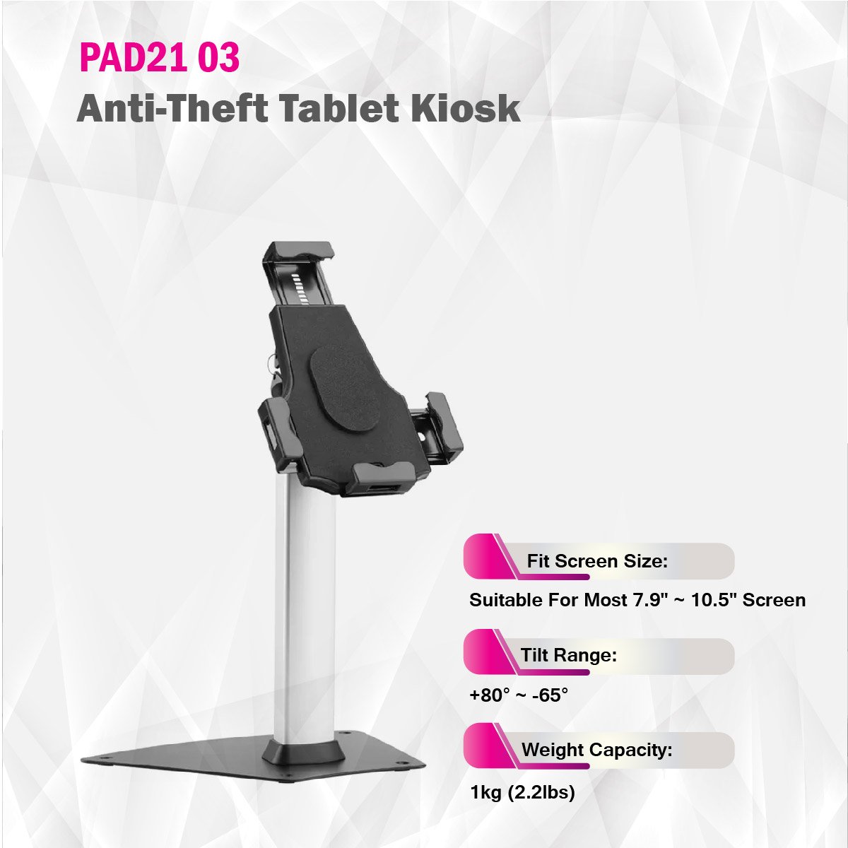 The PAD21 03 is a standard anti-theft countertop tablet kiosk stand designed to enhance the security and functionality of your tablet. Crafted from a combination of durable materials, including steel, aluminum, and plastic, it ensures the safety of your tablet while offering flexibility. The stand features a sleek design with a fine texture grey and matte black color scheme, adding a modern touch to your workspace.With dimensions of 315.5x217x424mm (12.4"x8.5"x16.7"), this tablet kiosk stand is suitable for a wide range of tablets with screen sizes ranging from 7.9" to 10.5". It can securely hold tablets with a weight capacity of up to 1kg (2.2lbs).One of its key features is its versatile tilt range, allowing for adjustments from +80° to -65°, and screen rotation capabilities spanning +180° to -180°. This flexibility ensures you can find the perfect viewing angle for your tablet.