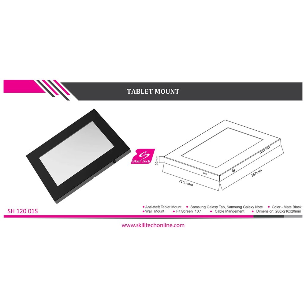 The SKILL TECH SH 12001S anti-theft steel Samsung tablet enclosure is designed to serve directly mounting onto the wall or installing compatibly with Antitheft Tablet Mount series base. It features anti-theft screws to secure Samsung in the public for display. The Samsung case is designed with Internal cable management that can keeps cable organized.