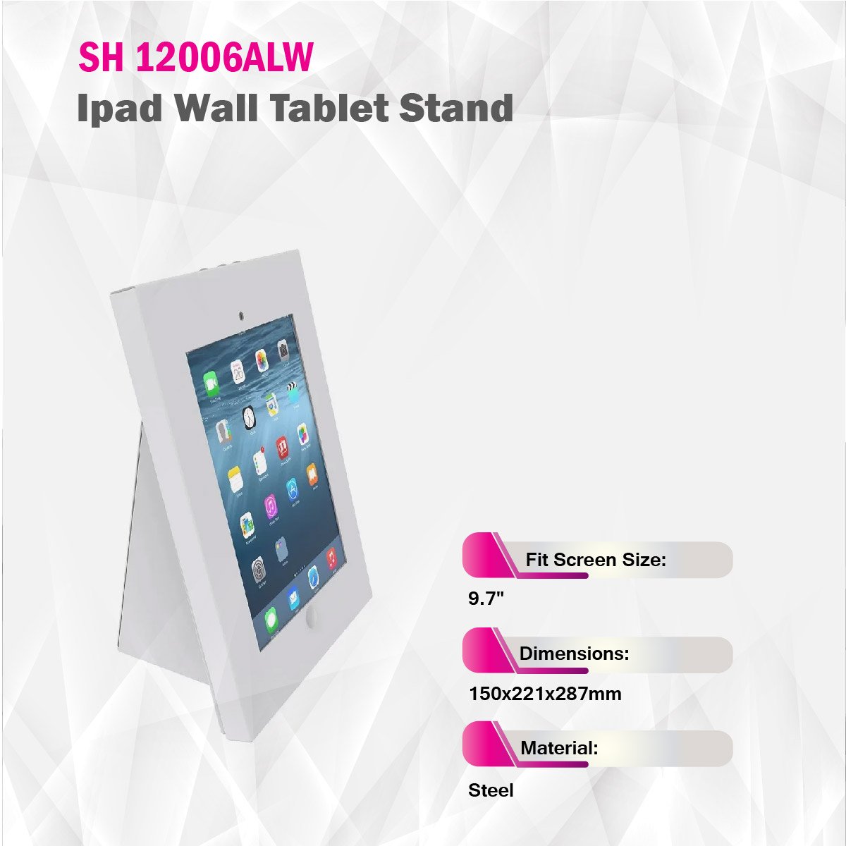 The SH 12006ALW, Anti-Theft iPad wall/Table Installing Base with enclosure and lock, is designed to mount on walls or on tables with multiple installation ways. Fully Steel constructed base is rigid and stable, satisfying the needs of displaying in the public securely. Besides, it offers two alternative installing angles to achieve different viewing needs. The iPad enclosure is designed with home button, power cable and other ports available to satisfy extra operating needs.