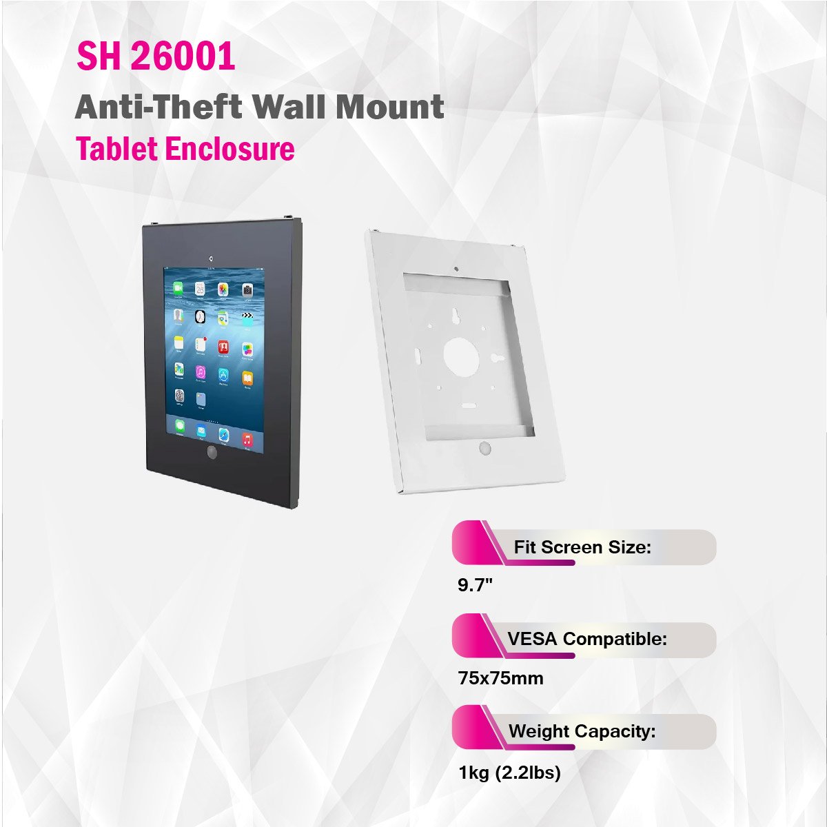 The new SH 26001 anti-theft steel iPad enclosure with lock is designed to serve directly mounting onto the wall or installing compatibly with SH 260 series base. The iPad case is designed with home button, power cable and other ports available to satisfy extra operating needs. It features anti-theft lock to secure iPad, making it ideal for education, healthcare, corporate, retail and point of sale environments.