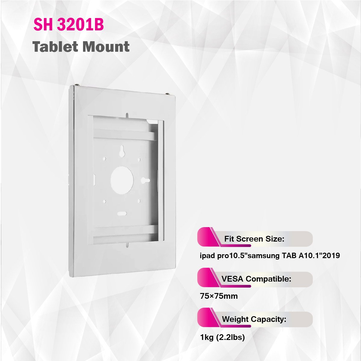 Easy to install with the included hardware, SH 3201B is a great permanent addition to retail displays or offices! The locking screw ensures additional safety of your property, and the rotating design allows for portrait or landscape setting, adapting to the needs of your contents. With a powder-coated finish, this steel enclosure will last for years of use while the matte colour complements any room décor. With 75X75 VESA pattern, SH 3201B can attach to a VESA compatible monitor arm or stand, tailoring the way of tablet display as you want.