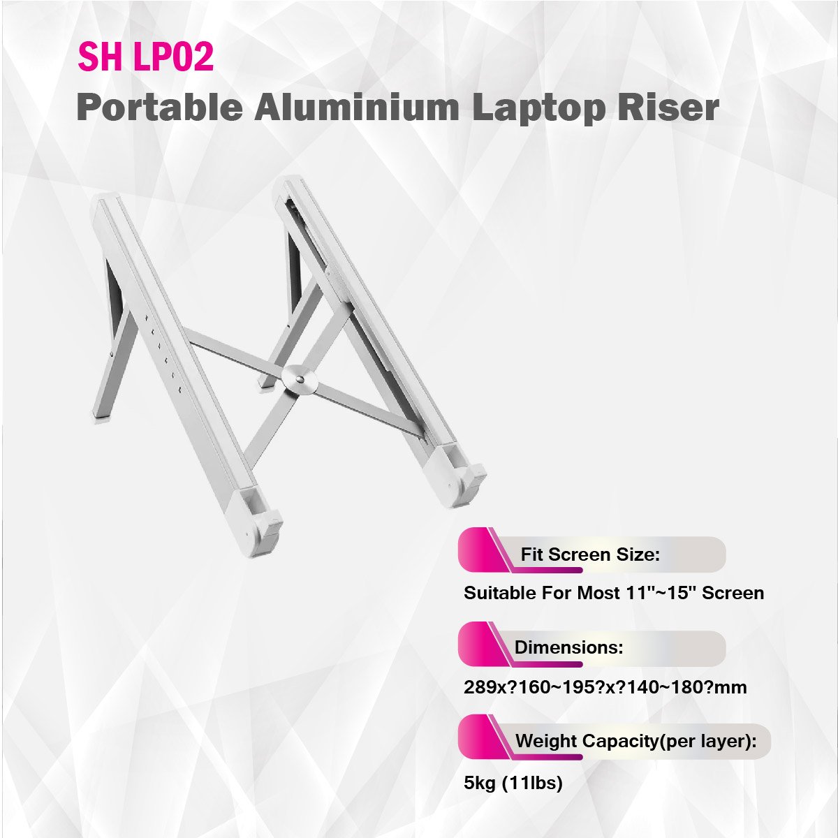 The laptop holder offers 6 levels for height adjustment, elevating your laptop to the perfect viewing height. Helps to protect your eyes and improve the body posture over long hours of working on the notebook. The triangular structure with high-strength aluminium alloy material has strong supportability. This laptop stand can support up to 5kg/11lbs weight, fit for almost all laptops from 11” to 15”. It is lightweight and can be easily folded into a 11.4” long strip. It's convenient to carry for business trip or anywhere you go.