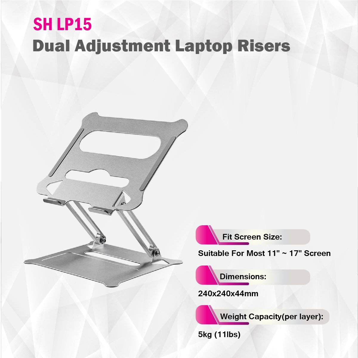 Made of high-quality aluminium alloy, the SH LP15 Stepless Adjustment Laptop Riser features a sleek surface and elegant appearance. Able to firmly hold most 11”-17” laptops and tablets while providing adjustability for comfortable viewing and optimal working angles. The open area below the upper surface provides airflow for heat dissipation with the added benefit of extra storage space for files and other small items.