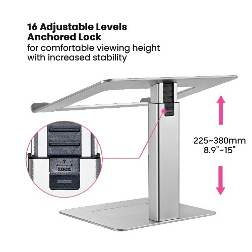 The SH LPS03-16 height-adjustable laptop riser provides an ergonomic solution for sitting or standing work. Aluminum construction provides a sleek, lighter, and elegant look. 16 Adjustable Levels Anchored Lock and a 15° angle of Incline for comfortable viewing height with increased stability, support up to 5 kg (11 lbs), no worry any wobble at all. The silicone pad ensures your laptop is stable on the stand and prevents any scratches. The open aluminum design provides good ventilation and airflow to prevent your laptop from overheating. Thanks to the open design, you could also keep your laptop peripherals under the stand, such as the keyboard, mouse, and other office items. It’s easy to assemble and reassemble. Detach it into 3 parts for storage and low-cost transportation.