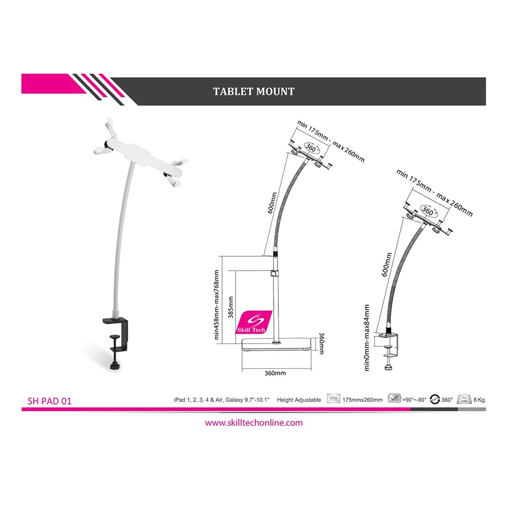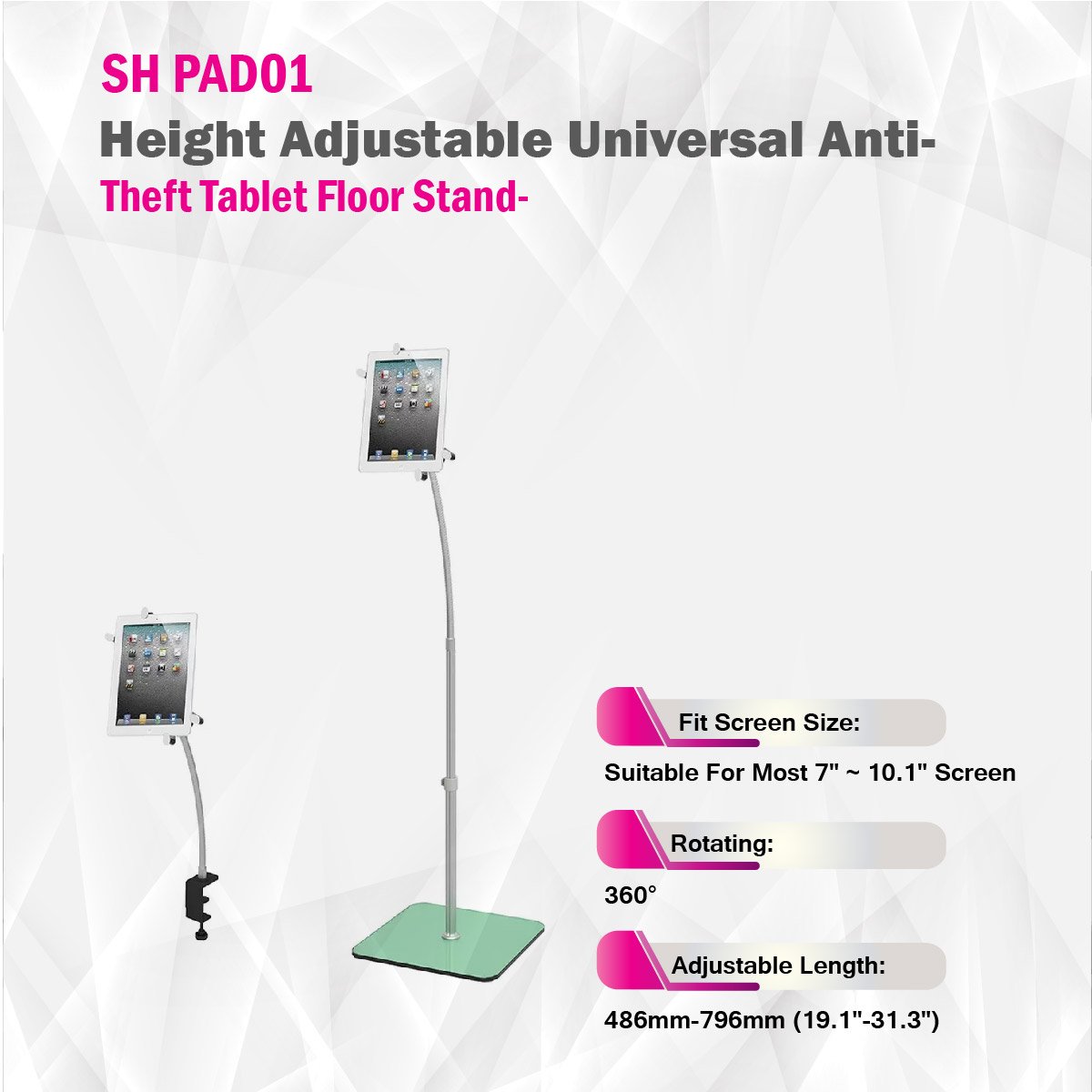 The SH PAD01 Height Adjustable Universal Anti-Theft Tablet Floor Stand is a versatile and user-friendly solution for securely displaying and interacting with tablets. Designed as part of the Standard Series, this floor stand is crafted from a combination of aluminum, steel, plastic, and glass, ensuring both durability and a sleek appearance. Its silver powder coating adds an elegant touch to any setting.This floor stand is compatible with a range of tablet models, including iPad min 1/2/3/4/Air, Samsung tablets, and various universal tablets with screen sizes from 7" to 10.1". It's an excellent choice for home showrooms, providing a professional and interactive way to showcase products or information.Installation options are flexible, as you can use either the clamp holder or the floor stand, depending on your needs. The stand allows for 360° rotation, enabling users to adjust the tablet to their preferred viewing angle. The clamp range spans from a minimum of 175mm to a maximum of 260mm (approximately 6.9" to 10.2"), accommodating various tablet sizes. Additionally, the stand's adjustable length ranges from 486mm to 796mm (approximately 19.1" to 31.3").