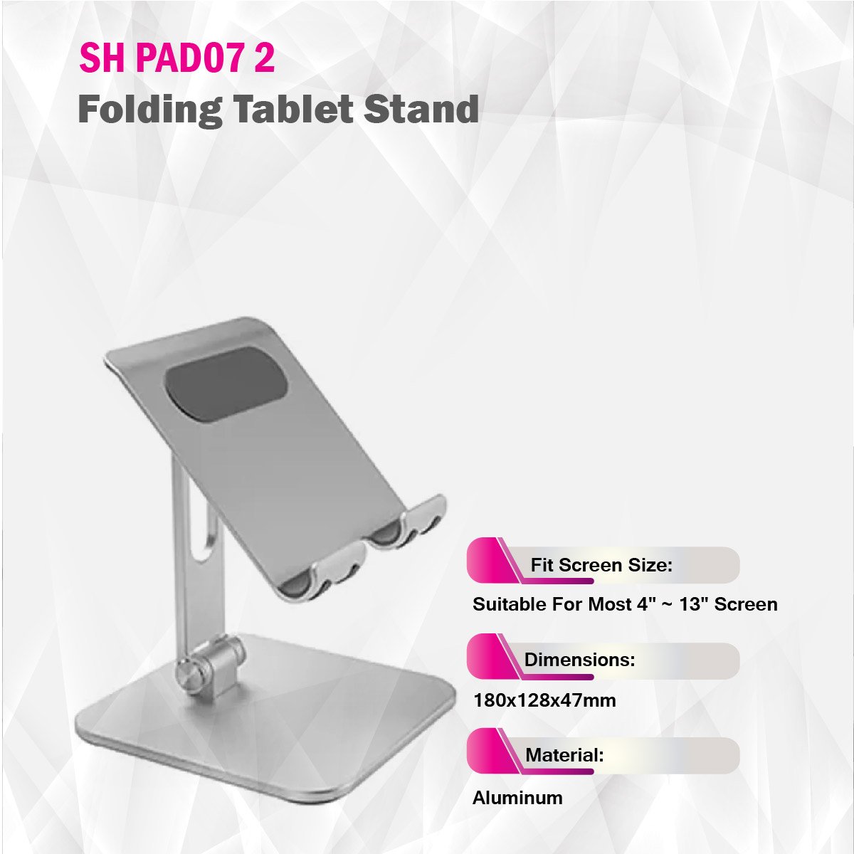 The SH PAD07 2 Folding Tablet Stand is a standard-grade accessory designed for the secure placement of tablets. Crafted from durable aluminum material with a surface finish of sand-blasted Aluminum Anodic Oxidation, this tablet stand is available in three stylish color options: Black, Silver, and Grey.With compact dimensions of 180x128x47mm (7.1"x5"x1.9"), this folding tablet stand is highly versatile, accommodating a wide range of devices with screen sizes from 4 inches to 13 inches. Whether you have a small tablet or a larger one, this stand provides a stable and adjustable platform for comfortable and convenient use.