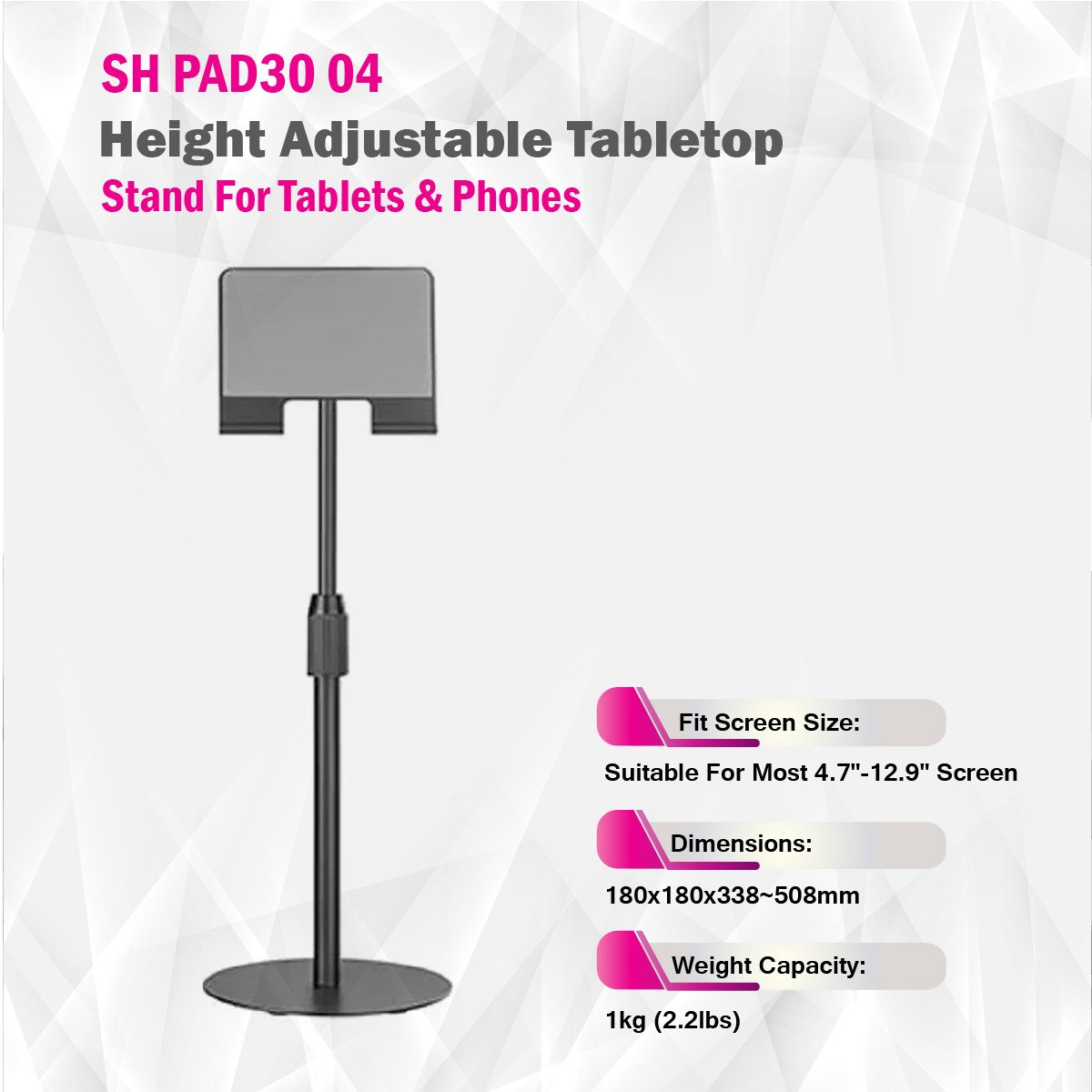 The SH PAD30 04 Height Adjustable Tabletop Stand is a standard-grade solution designed for securely holding tablets and phones in various applications. Crafted from a blend of plastic and steel materials, this stand offers durability and stability for your devices. It's available in two contemporary color options: Matte Black and Matte White.Measuring 180x180x338~508mm (7.1"x7.1"x13.3"~20") in dimensions, this tabletop stand is compatible with a wide range of devices. It accommodates devices with screen sizes ranging from 4.7" to 12.9", making it versatile for a variety of tablets and phones.The stand offers convenient adjustability with a tilt range of +90° to -10°, allowing you to find the perfect viewing angle for your device. It also provides a swivel range of +180° to -180°, enhancing flexibility in positioning your tablet or phone.