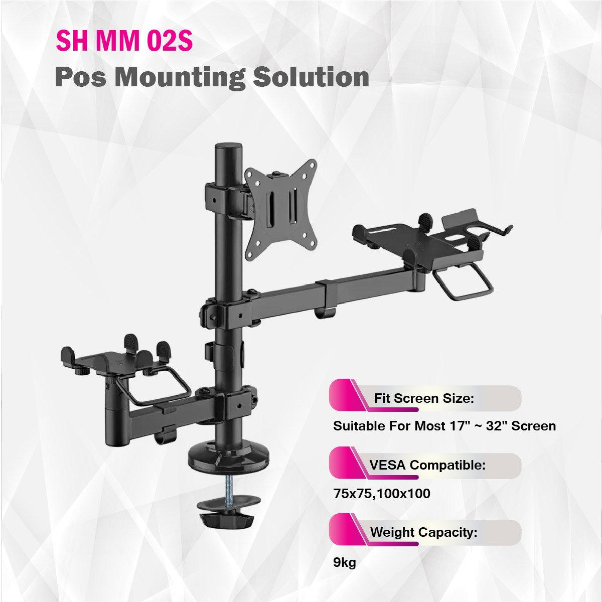 The SH MM 02S is a versatile and space-saving mounting solution designed for POS (Point of Sale) applications. Crafted from durable materials including aluminum, steel, and plastic, and featuring a fine texture black powder-coated finish, this mount offers both strength and a modern aesthetic.This mounting solution is suitable for most flat screens ranging from 17 inches to 32 inches in size. Each screen can have a weight capacity of up to 9kg, providing secure support for your display needs. It is compatible with VESA patterns of 75x75 and 100x100, ensuring it can accommodate a variety of monitors.The SH MM 02S offers flexible positioning options. You can tilt the screen within a range of +45° to -45°, swivel it from +90° to -90°, and even rotate it a full 180°, providing an adaptable viewing experience. Installation is straightforward, utilizing a grommet system, and it is suitable for desktops with a thickness ranging from 10mm to 40mm.