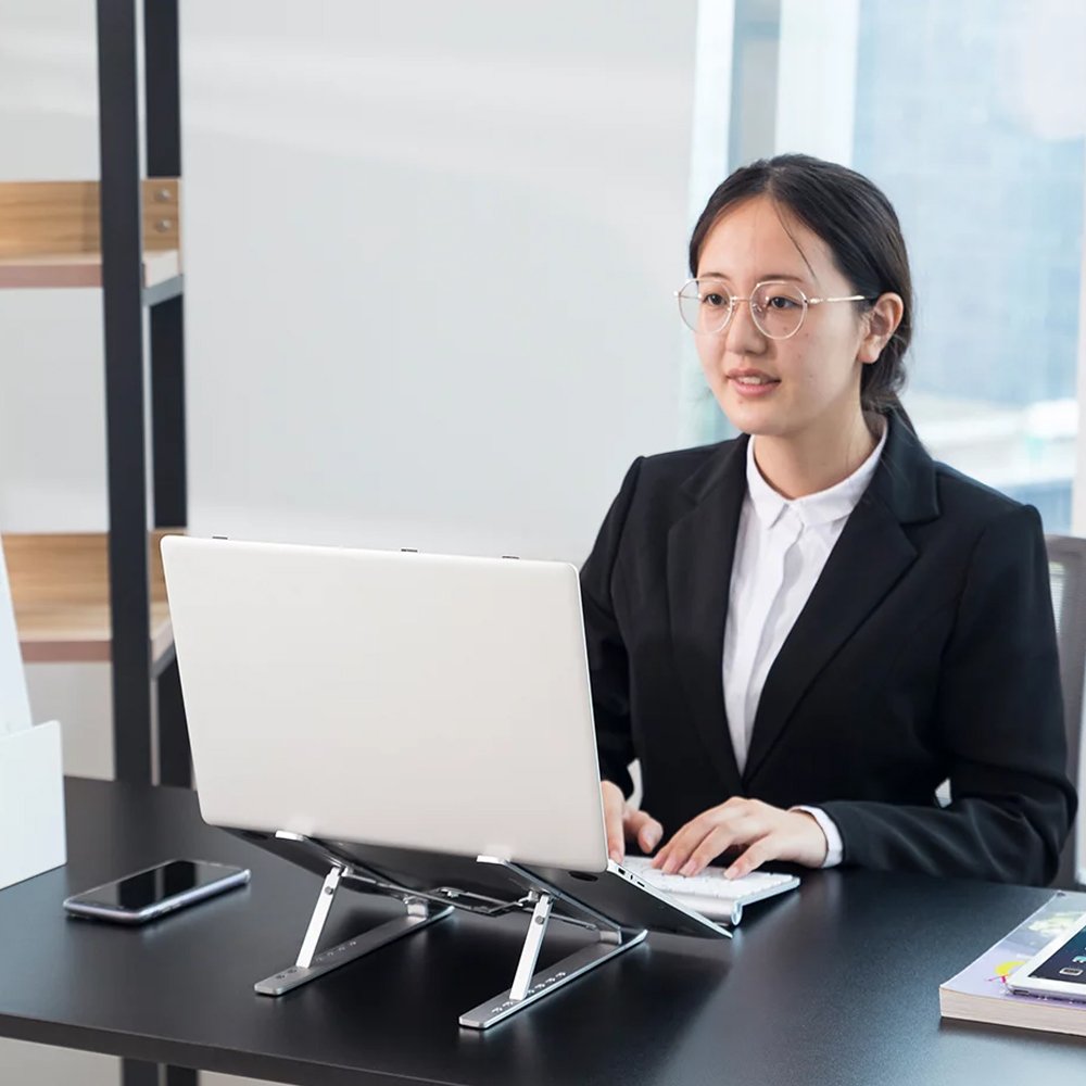 The laptop holder offers 7 levels for height adjustment, elevating your laptop to the perfect viewing height. Helps to protect your eyes and improve the body posture over long hours of working on the notebook. The triangular structure with high-strength aluminum alloy material has strong supportability. This laptop stand can support up to 5kg11lbs weight, fit for almost all laptops from 11” to 15”. It is lightweight and can be easily folded into a 9.4” long strip. It's convenient to carry for business trip or anywhere you go.